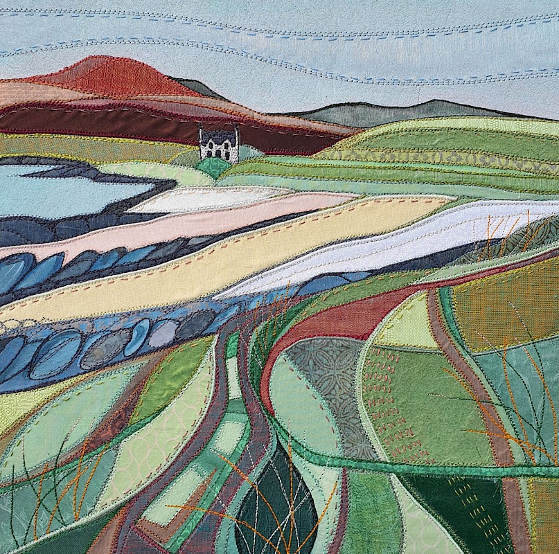 Debbie’s work is developed using layering of various techniques. Drawing forms the primary step to each piece, using black biro in sketchbooks to capture the feeling and movement of a place. The final pieces start with paint reflecting the sketch, which is used to define colour value, informing the following layers. These next layers are collage - both fabric and paper – then, finally, machine and hand embroidery. The resulting work is both considered, and intuitive, with several dimensions to it: image, composition, colour, line and texture.