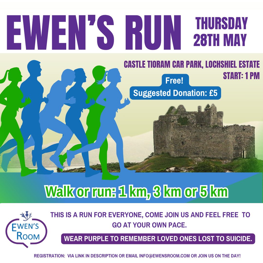 Get moving for your mental health and remember loved ones who have struggled or are struggling with theirs. Free entry, suggested donation. 1km / 3km / 5km to walk or run. Meet at Castle Tioram Car Park at 1 PM.