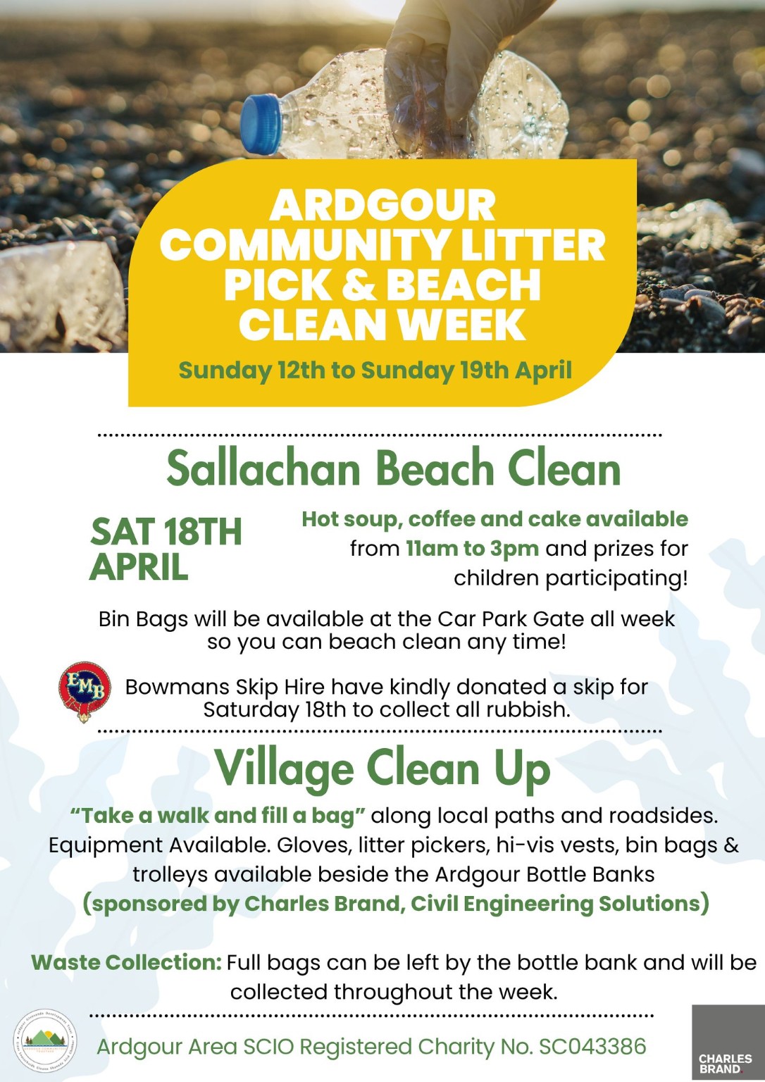 Get involved anytime during the week, or join us at Salachan Beach on Saturday 18th (11am-3pm) for a community clean-up, with soup, coffee, cake and prizes for the kids. Thank you to Bowmans Skip Hire and Charles Brand for their support!
